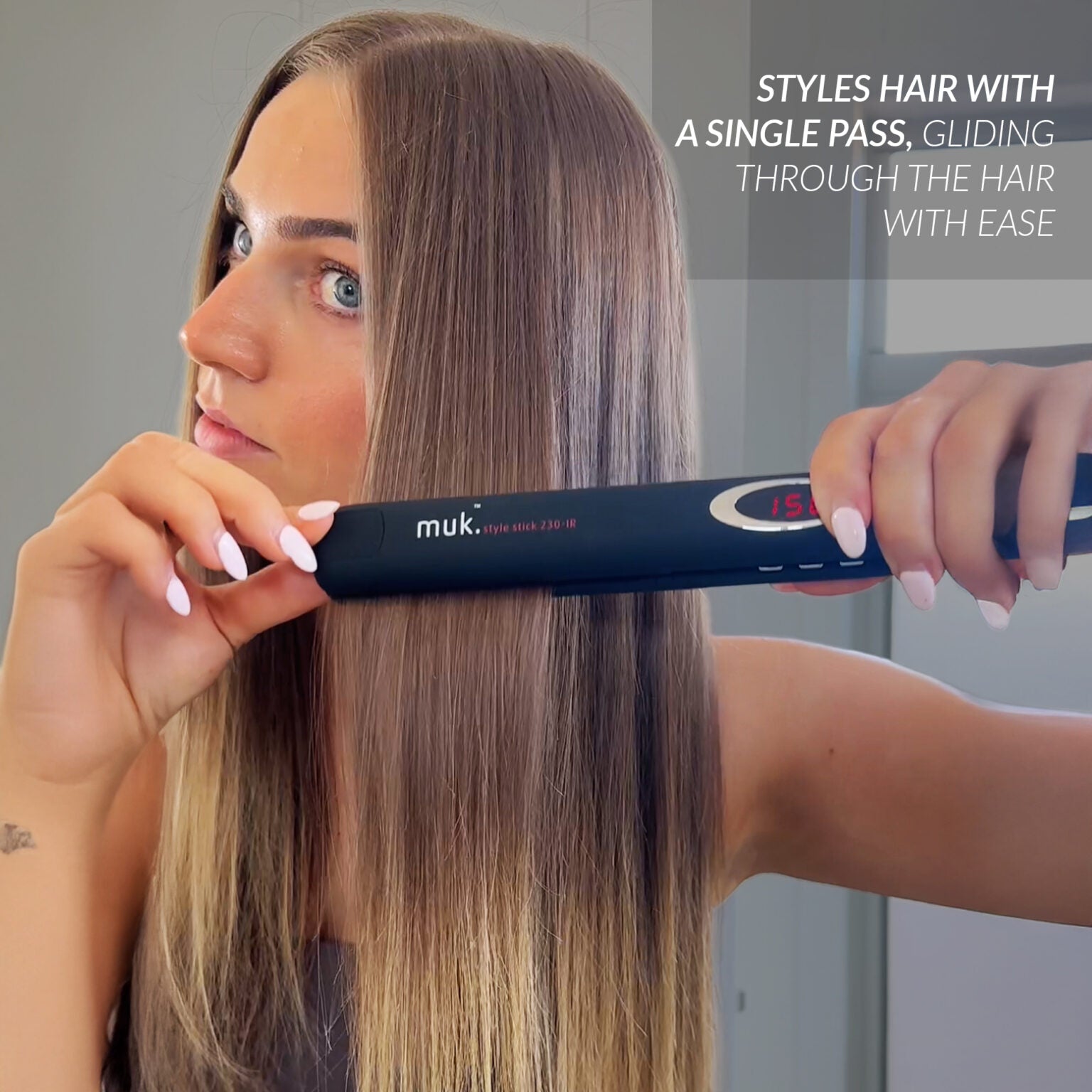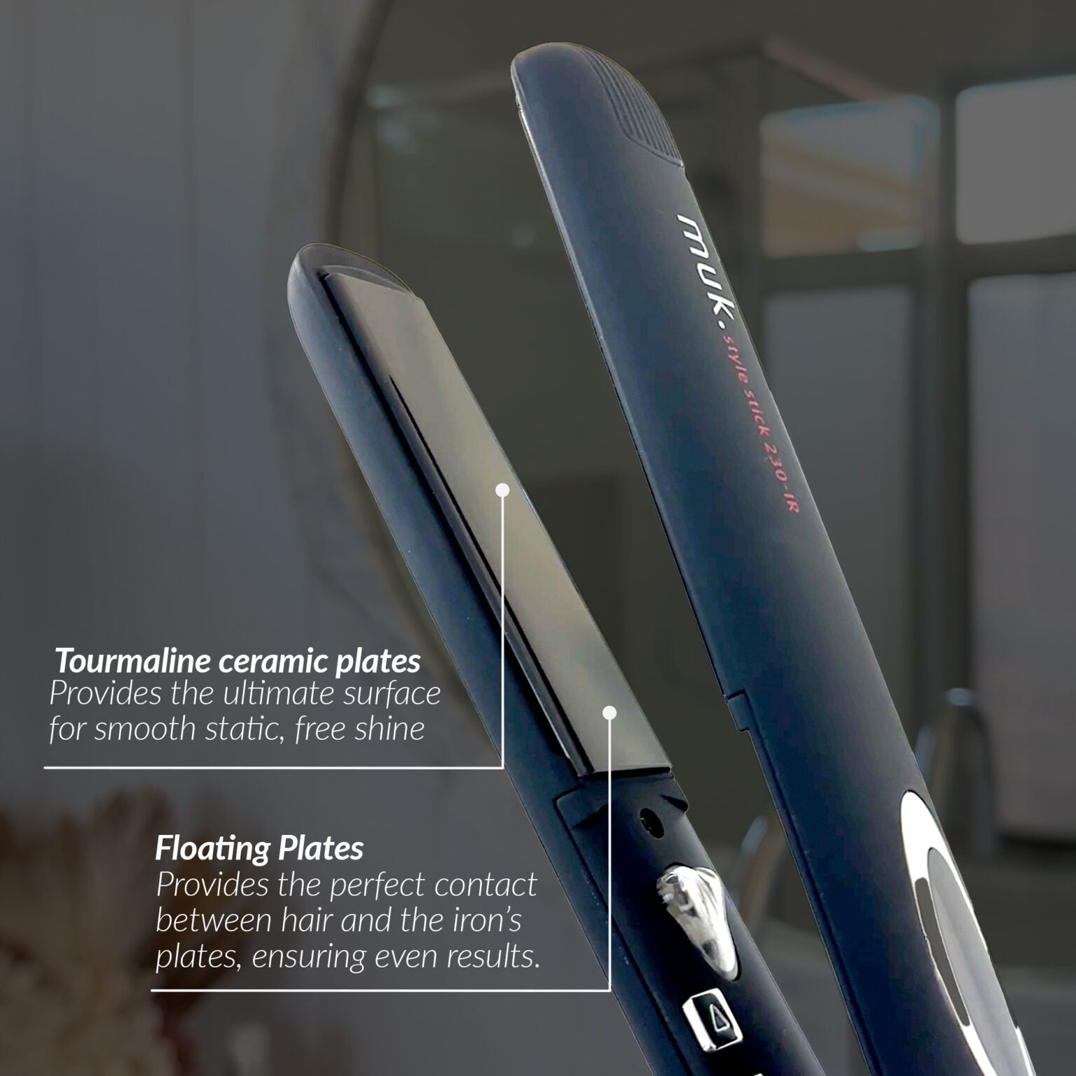 The muk Style Stick 230IR is your weapon for smooth, shiny and sleek hair. Available in two sizes – for normal and thick/coarse hair – each iron features infra-red heat technology, which gently heats the hair internally. It protects the delicate surface structure of the hair, so your hair looks healthy and strong. The floating tourmaline ceramic plates provide the ultimate surface for smooth, static free shine whether you straighten or add wave to the hair.