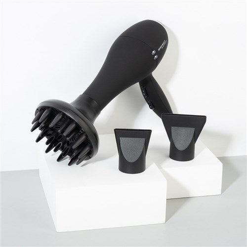 Silver Bullet Black Velvet Professional Hair Dryer with Diffuser cuts down styling time for ultimate efficiency as smooth as velvet. With stylish black matte exterior and minimalist design, Silver Bullet Black Velvet Professional Hair Dryer is perfectly balanced. Powerful, long-life AC motor delivers a mighty 2000 watts. 2 speed settings, 3 heat settings and a cold shot function to lock style in place. Cold shot function sets style in place. Includes two nozzles, one wide and one regular, as well as a professional diffuser to satisfy every styling demand.
