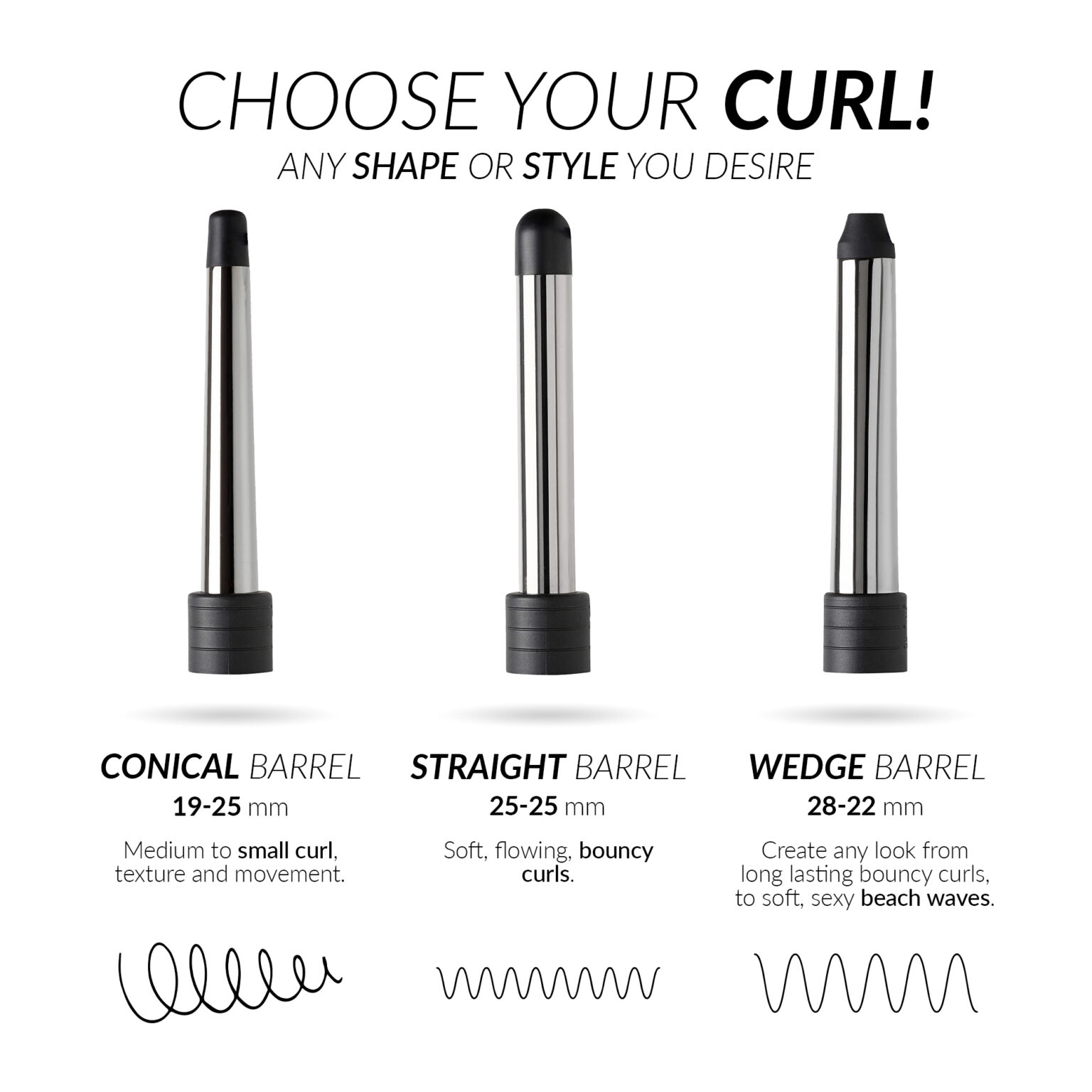 The ultimate styling tool for all hair types, the muk Curl Stick is designed to create long lasting curls, any shape or style you desire. With 3 interchangeable barrels in various sizes, the curling options are limitless. Each barrel is finished in smooth titanium providing instant results of static free curls and shine.